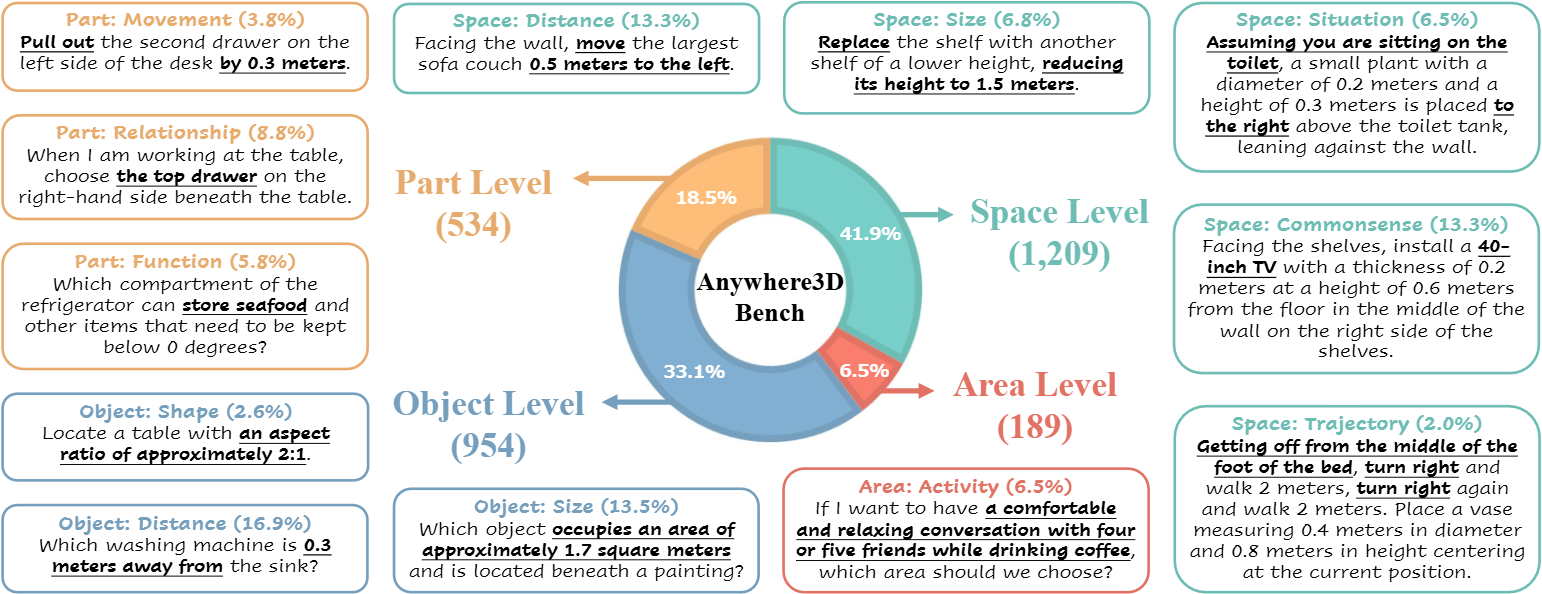 Anywhere3D-Bench involves multi-level 3D visual grounding (part, object, area, space) with distinct expression types.